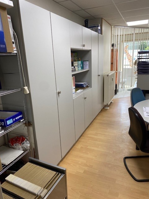 Ein langer großer Büroschrank beinhaltet eine eingebaute Pantryküche mit Kaffeeautomat, sowie verschlossene Schrankteile für private Kleidungsstücke. Eine Ordnerdrehsäule ist ebenfalls vorhanden.