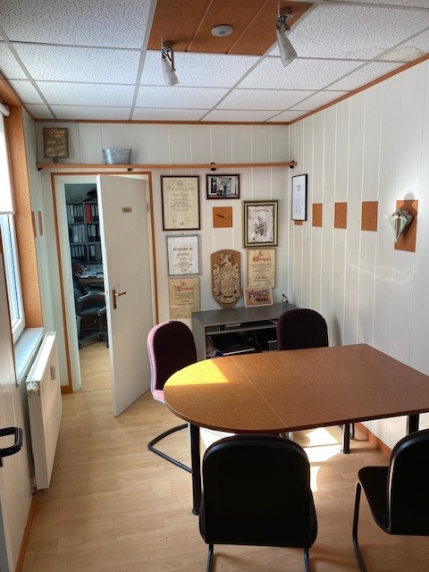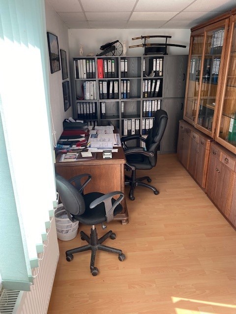 Dahinter befindet sich ein abgeschlossener Beratungsraum, mit einem angrenzenden weiteren Büro. Es ist ein WC mit Waschtisch vorhanden, erreichbar direkt vom Flur aus.