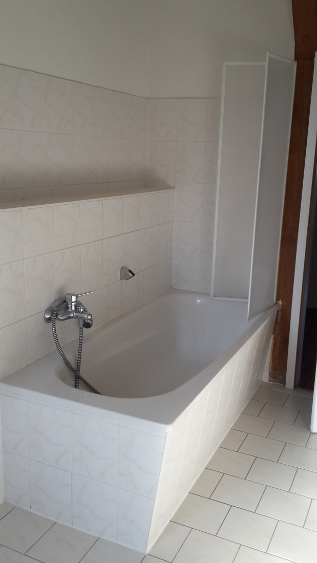 Tageslichtbad mit Wanne, Garage, Stellplatz, Laminatboden, Oberlicht im Wohnzimmer